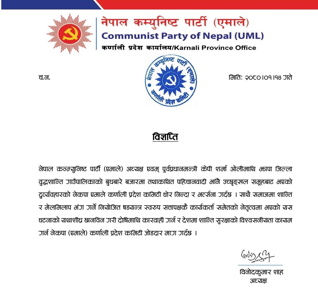 अध्यक्ष ओलीमाथि झापाको वुद्धशान्ति गाउँपालिकाको बुधबारे बजारमा कोशी प्रदेश नामकरणविरुद्ध आन्दोलन गरिरहेको उच्छृंखल समूहले आक्रमण गरेको थियो । एमाले कर्णाली प्रदेश कमिटीले सत्तापक्षकै कार्यकर्ता समेतको नेतृत्वमा भएको घटनाको यथाशीघ्र छानविन गरी दोषिमाथि कारवाही गर्न र शान्ति सुरक्षाको विश्वसनीयता कायम गर्न सरकारसंग माग गरेको छ ।